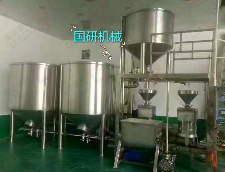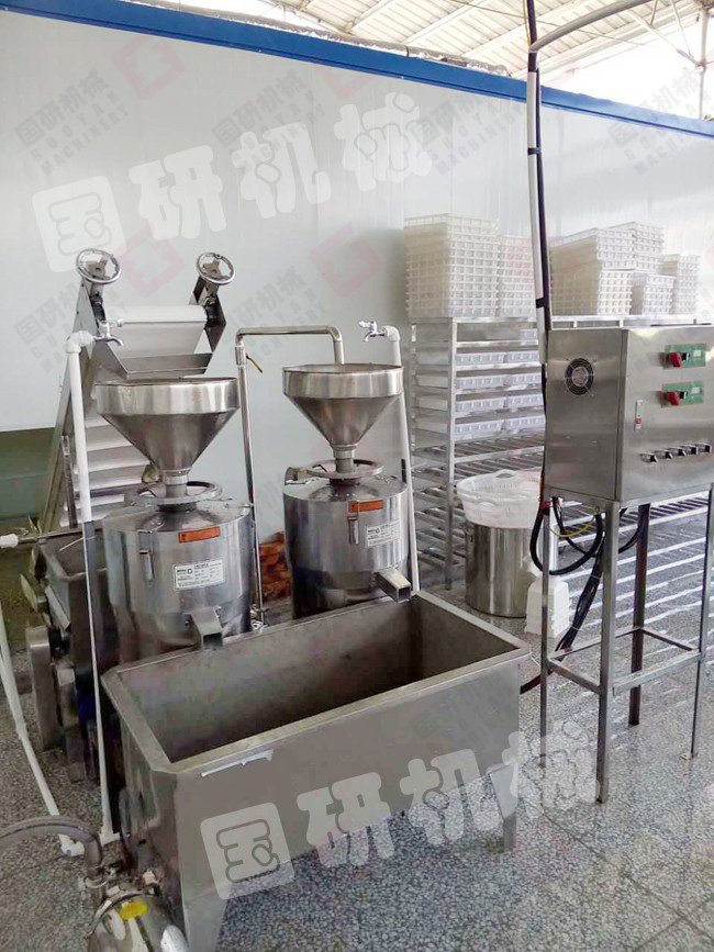 加工豆腐有六道工序:清洗浸泡(夏天4个小时,冬天6个小时,目的是更大限度的确保出浆率)—磨浆分离(传统工艺需要人工筛浆,而机器是采用浆渣自动分离,减轻了人力,极大提高生产效率)—高温煮浆(豆浆自动流入煮浆桶,通过蒸汽加热煮熟)—点浆(豆浆煮开后,再加入凝固剂成型)—压榨(挤出水份)—成品豆腐。