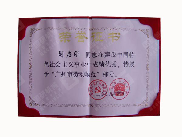 广州市委、市政府授予刘启刚同志广州市劳动模范荣誉证书