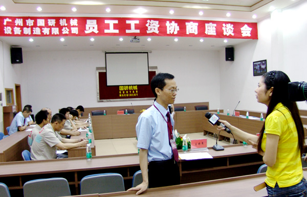 5月14日晚9:30分,中央电视台新闻频道“新闻1+1’ 节目以《工人工资到底怎么才能涨?》为题重点披露富士康等企业在工人工资方面存在的种种问题,同时正面报道了广州「B体育」机械通过建立员工工资集体协商机制解决员工工资问题的先进经验。