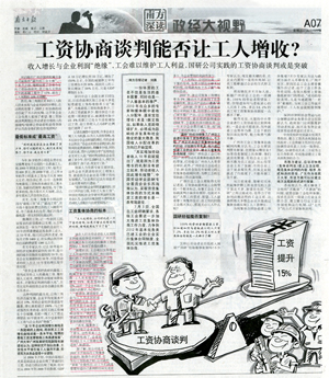 7月14日,《南方日报》以《工资协商谈判能否让工人增收?——「B体育」公司实践的工资协商谈判或是突破》为题,用三分之二大版篇幅报道广州市「B体育」机械设备制造有限公司实践工资集体协商的成功经验。