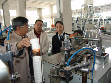 张教授一行听取了总经理王声位的汇报,并在公司总经理王声位,副总经理、党支部书记王声跃的陪同下对我司总部、塑料机械厂、食品机械厂进行参观指导。在塑料机械成品展厅,张教授在详细了解塑料机械的生产工艺后,对我司塑料机器的功能颇为赞赏,对我司机器的环保性能给予了充分的肯定,并对我司产品的设计及发展方向提出了具体的要求和建议。