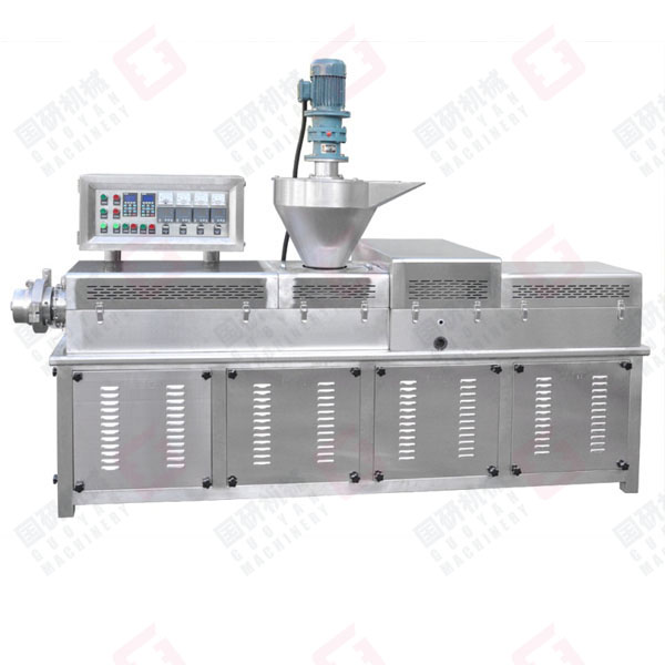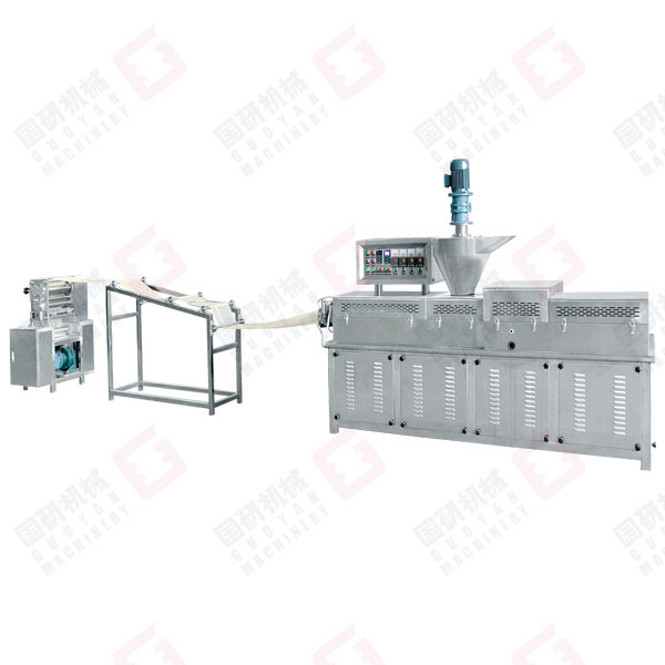 原料(面粉)→加水断续搅拌→物料输送→强制喂料→高温半膨化挤出→面片冷却输送→切条切断→包装